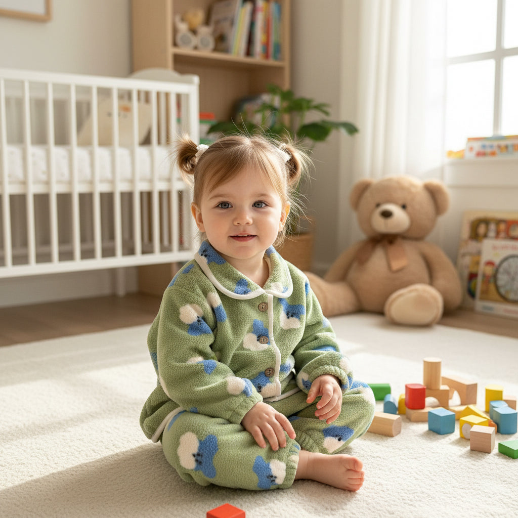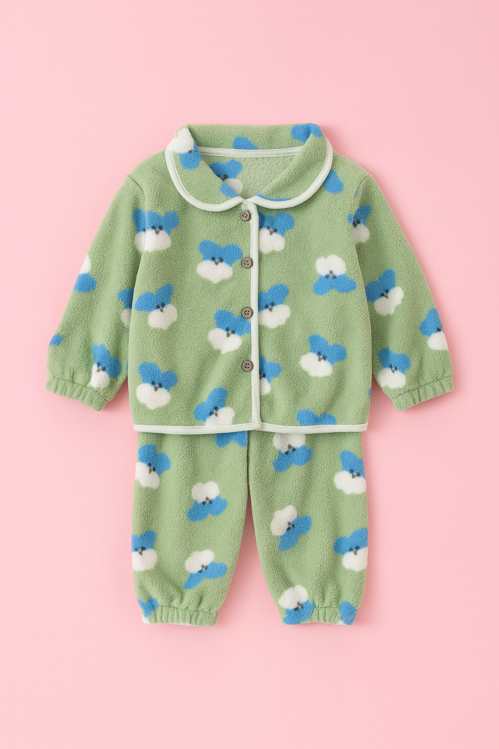 This is a soft, warm, winter-ready fleece pyjama set made from plush snow-flake textured fabric. The material is thick, cozy, and gentle on the skin, perfect for colder seasons. The set includes a long-sleeve top and matching pants, ideal for home, sleep, and indoor warmth.