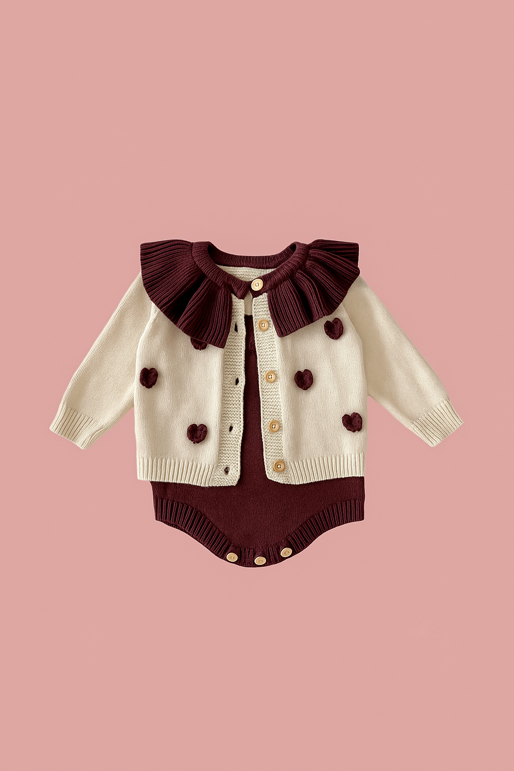 Adorable two-piece knitted set designed for baby girls, featuring a cozy long-sleeve cardigan and matching romper. The soft cotton fabric ensures comfort, while the delicate ruffled collar and little heart details add a charming.