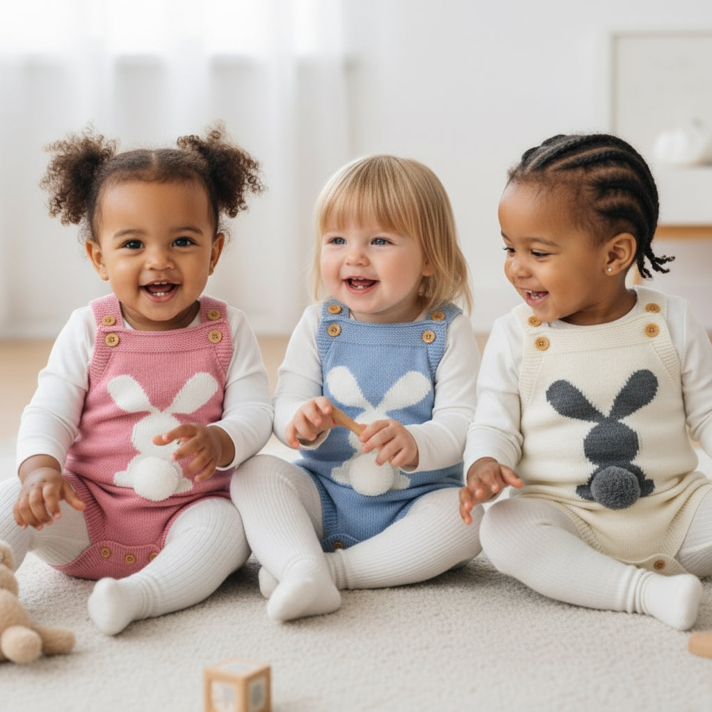 A cute soft-knitted rabbit sling romper with a sweet cartoon design, perfect for daily wear. Lightweight, comfy, and easy to move in, made from soft acrylic knit that’s gentle on baby skin.