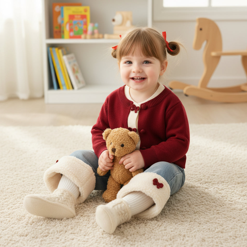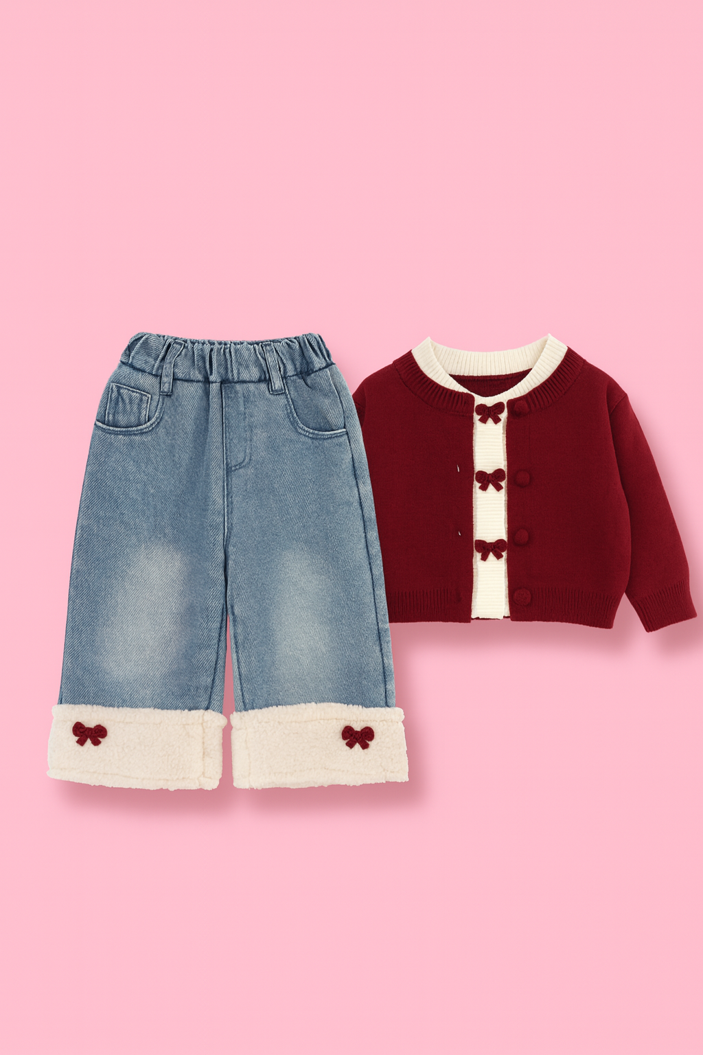 A charming winter two-piece set for girls, featuring a cosy knitted cardigan with a matching denim pants trimmed with soft fleece cuffs. The cardigan stands out with its classic round neckline, contrast ivory panel, and delicate mini bows for an elegant, vintage-inspired look. The jeans are designed for warmth and comfort, with an elastic waistband and plush lining at the hem for extra cosiness during cold days.