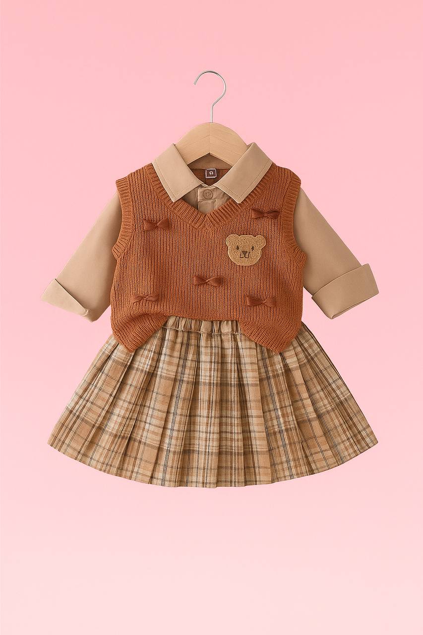 Dress your little one in cozy style with our adorable Caramel Set! This charming outfit includes a soft long-sleeve shirt, a knitted vest with cute bow details, and a pleated plaid skirt β€” all in warm caramel tones that bring comfort and elegance to any occasion. The sweet teddy patch adds a playful touch, making it perfect for outings, playdates, or capturing those picture-perfect moments.